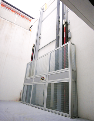 The piston that mechanically locks the unit to the floor is further controlled by an “all out, all in” limit switch that analyses the correct position. In case of piston malfunction – when it is not possible to set the platform in safety mode with pulsed operation from the electrical control panel – the limit switch sends the platform to the next floor so that it can then be secured. The shoulder of the platform passes beyond the point where the piston is mechanically blocked to the floor, thus allowing it to protrude.